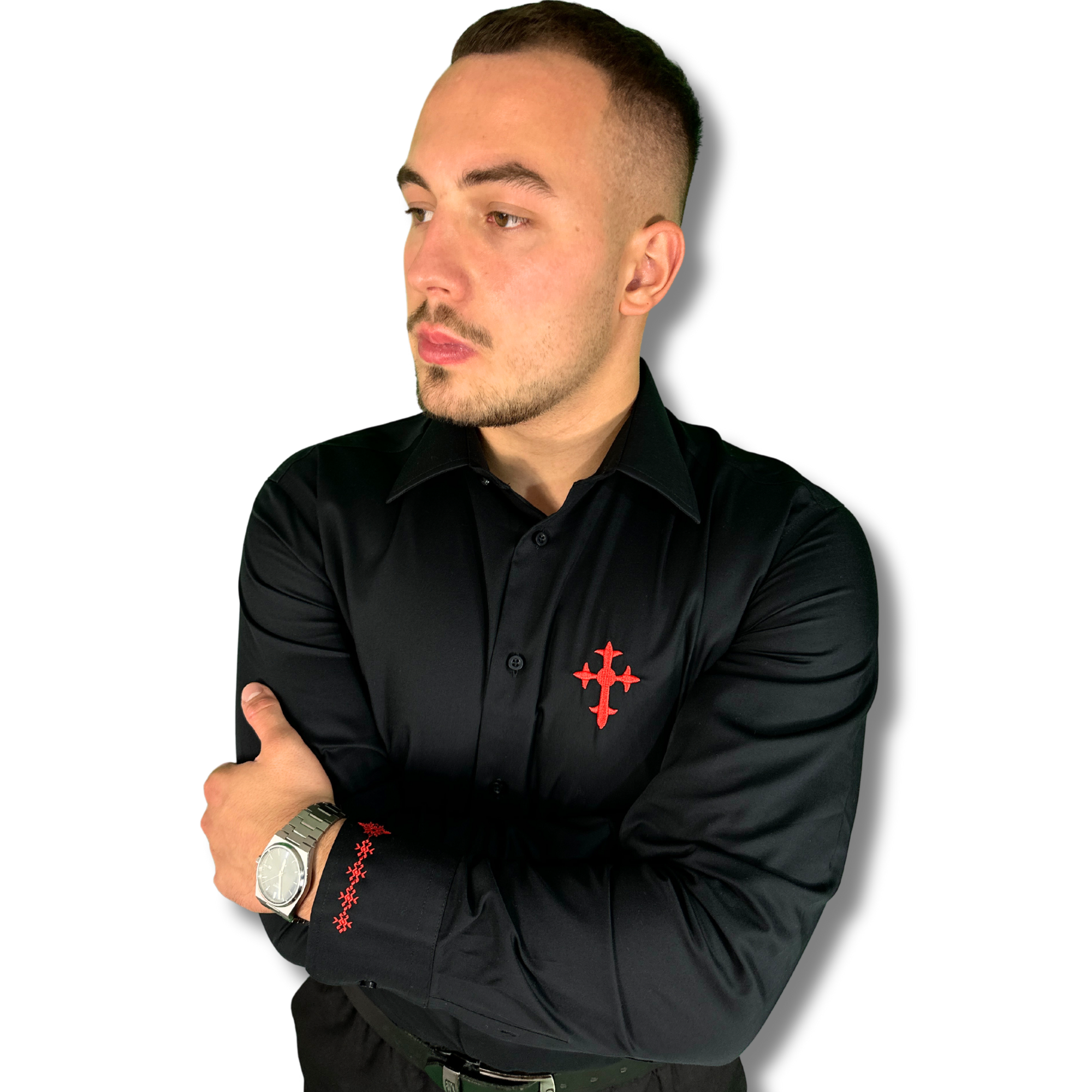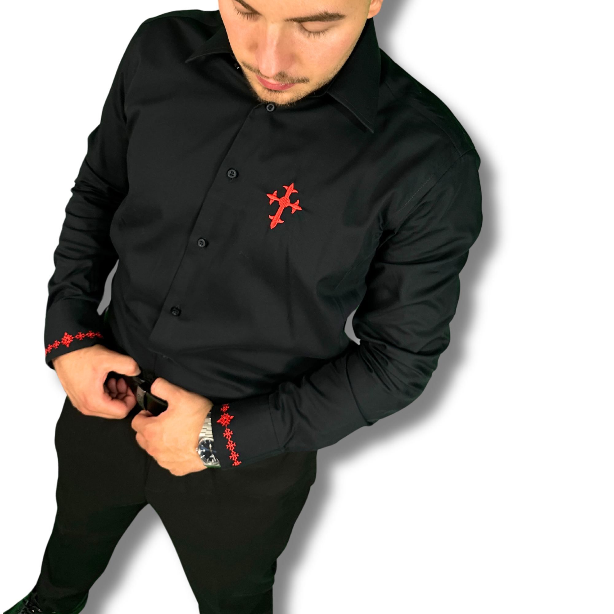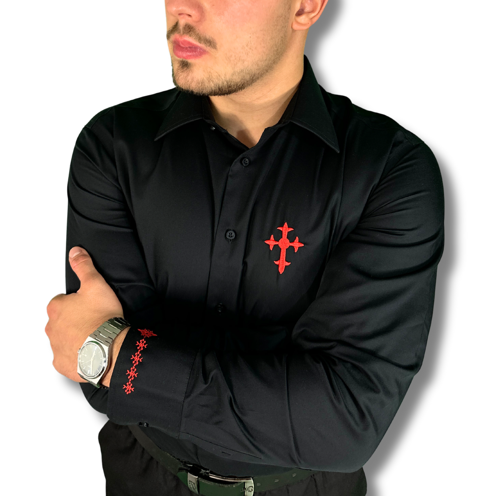 Camasa SACRAL Neagra, Brodata Ortodoxa Religioasa cu Semnul Sfintei Cruci, Lux Business din Bumbac, Nu Necesita Calcare, Broderie pe Maneci