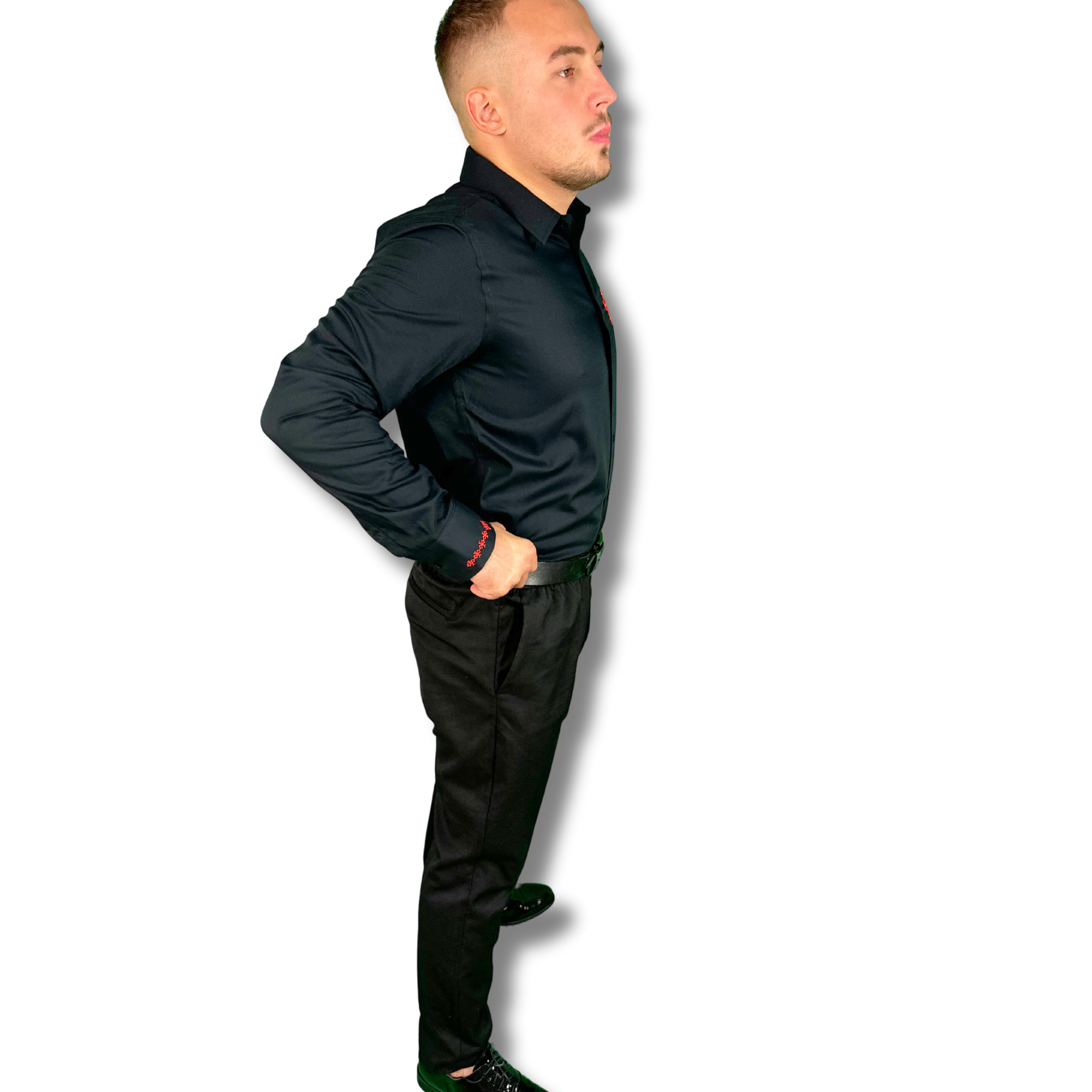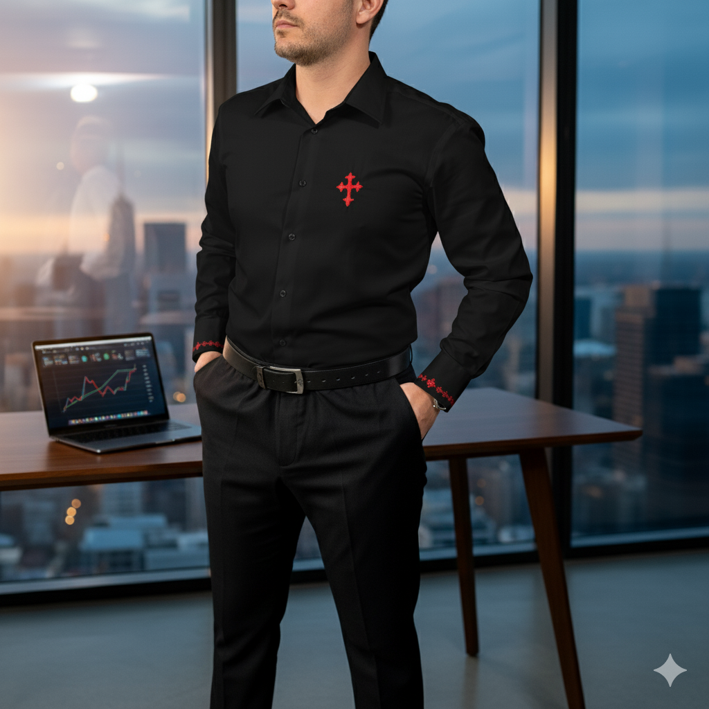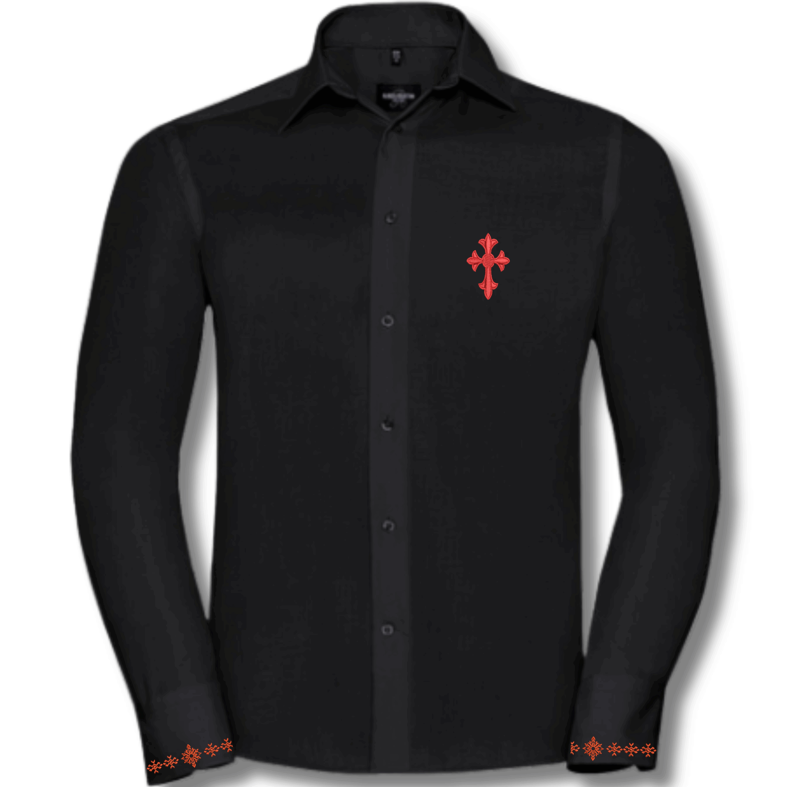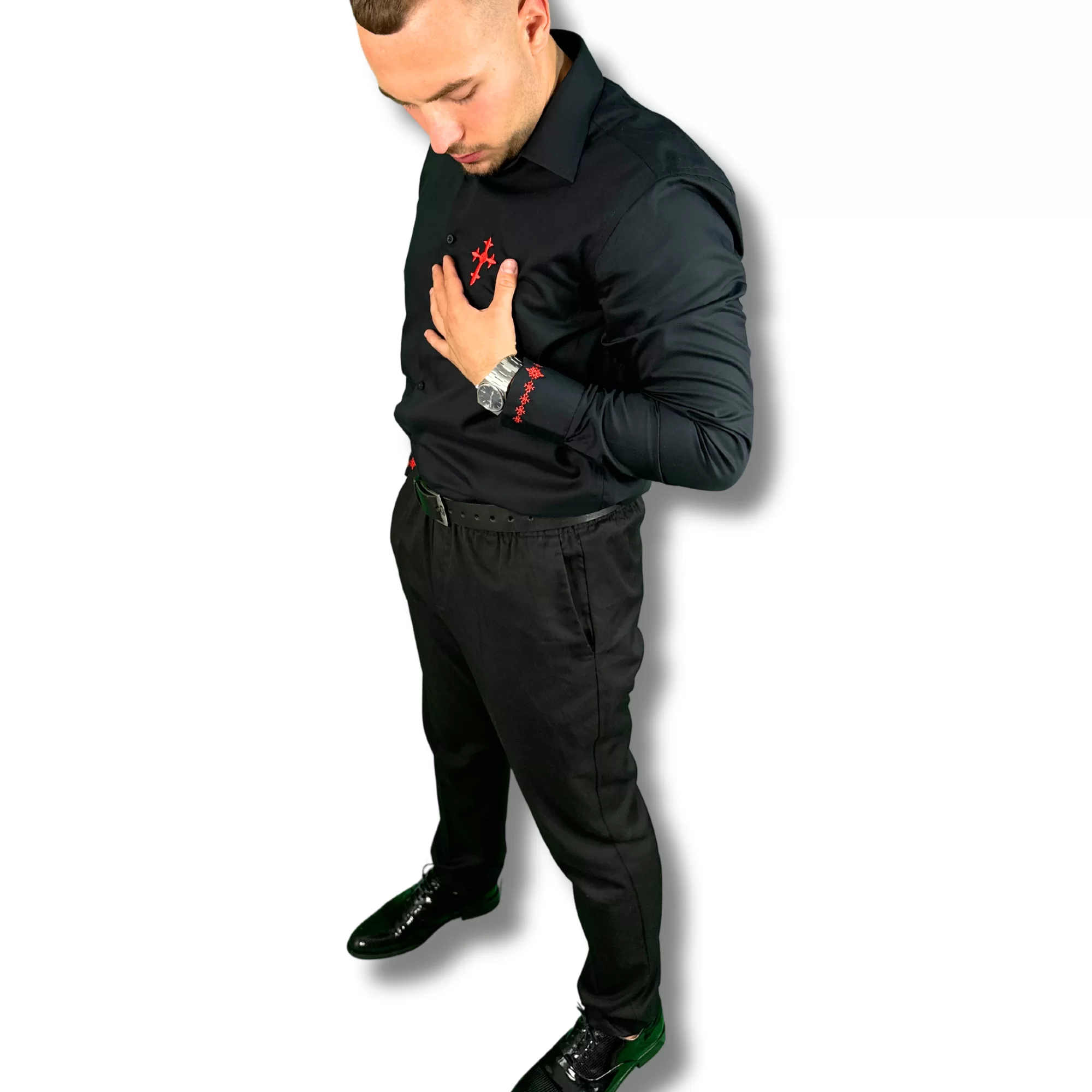 Camasa SACRAL Neagra, Brodata Ortodoxa Religioasa cu Semnul Sfintei Cruci, Lux Business din Bumbac, Nu Necesita Calcare, Broderie pe Maneci