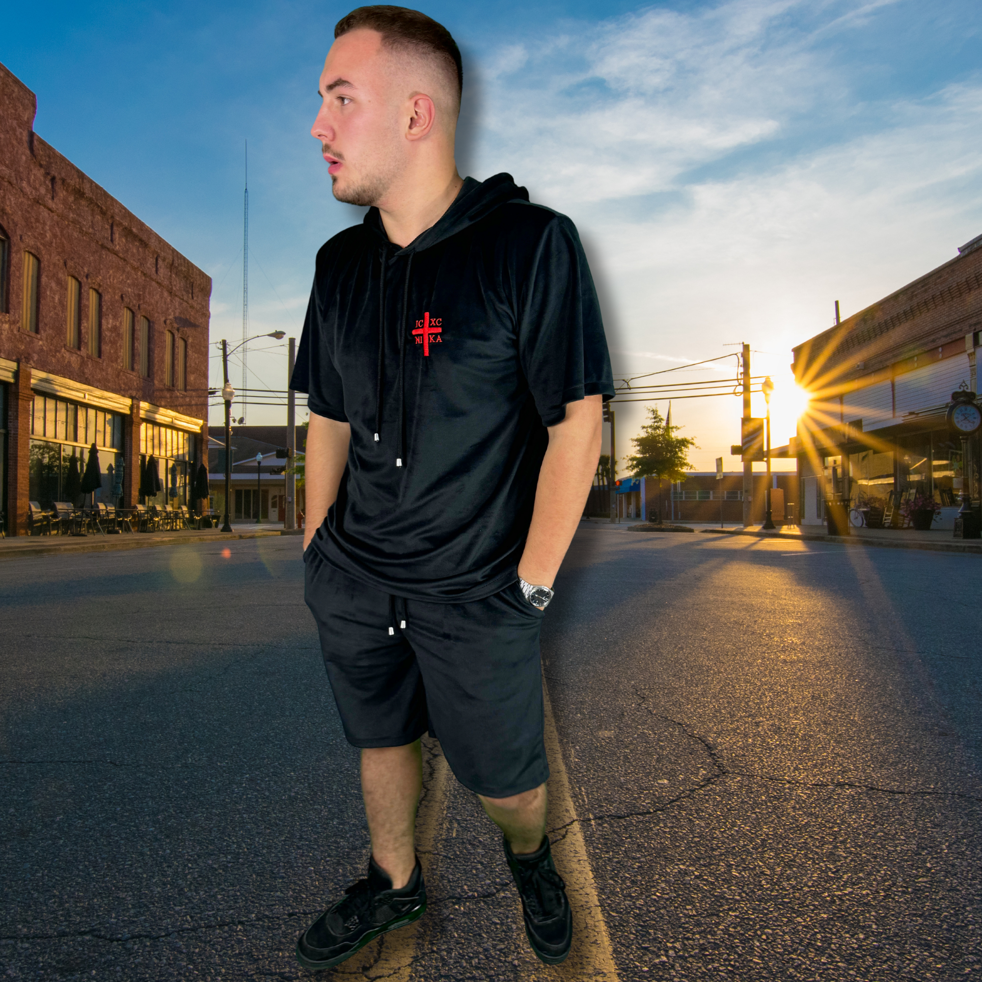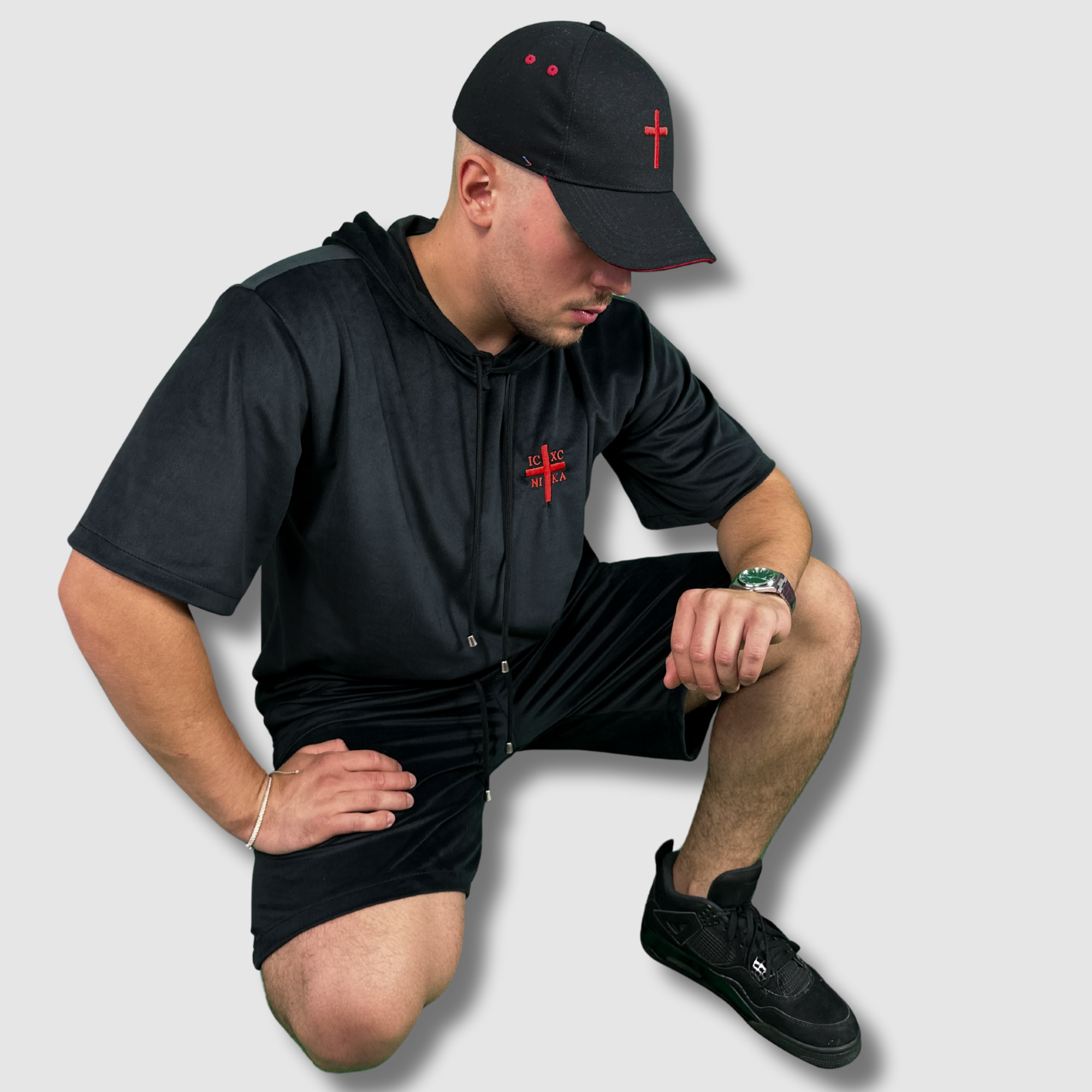 Compleu SACRAL, Catifea Neagra Luxury, Brodat Ortodox Religios cu Semnul Sfintei Cruci, IC XC NI KA, Fabricat în Romania