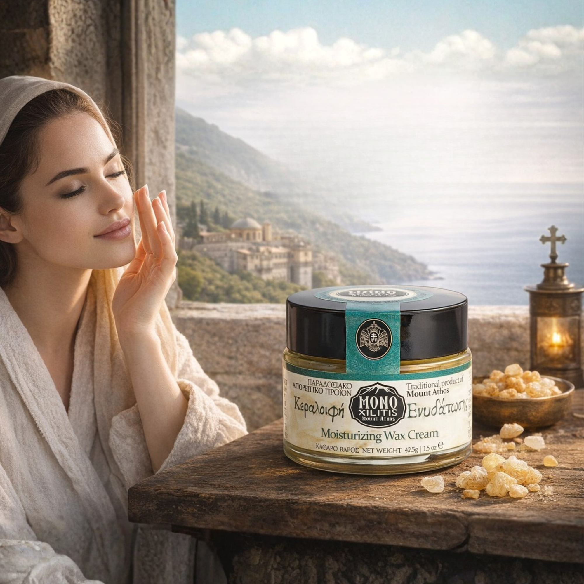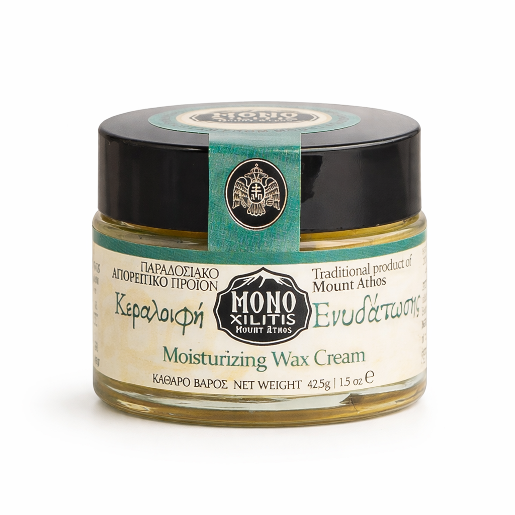 Cremă- Hidratare din Muntele Athos, realizată după rețete vechi monahale, pe bază de ceară de albine pură și ulei de măsline extravirgin. Este un produs natural, dedicat îngrijirii zilnice a pielii, fără substanțe chimice agresive.