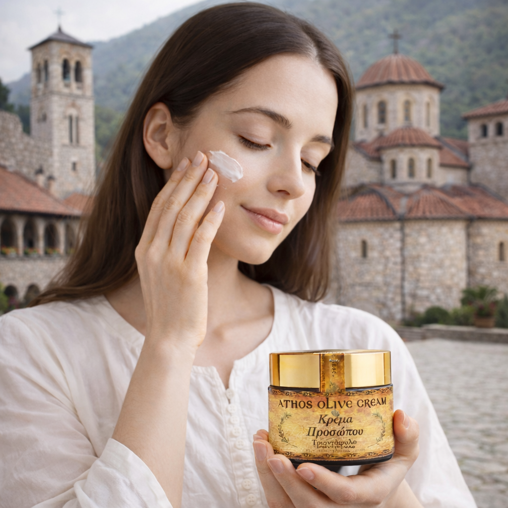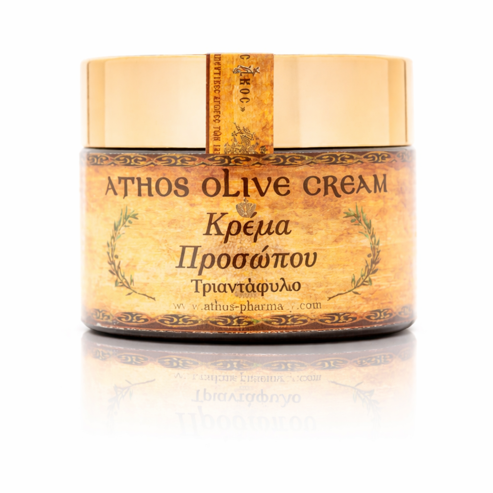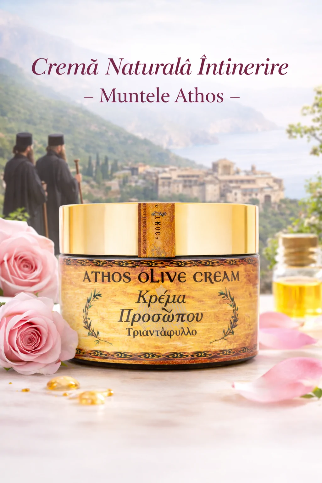 Inspirată din simplitatea și puritatea vieții monahale din Athos, Athos Olive Cream este o cremă de față 100% naturală, creată pentru a reda pielii tinerețea, elasticitatea și luminozitatea. Formula sa bogată îmbină uleiul de măsline cu ulei esențial de trandafir și extracte vegetale prețioase, fără substanțe chimice sau toxice, fiind ideală pentru îngrijirea zilnică a tenului.