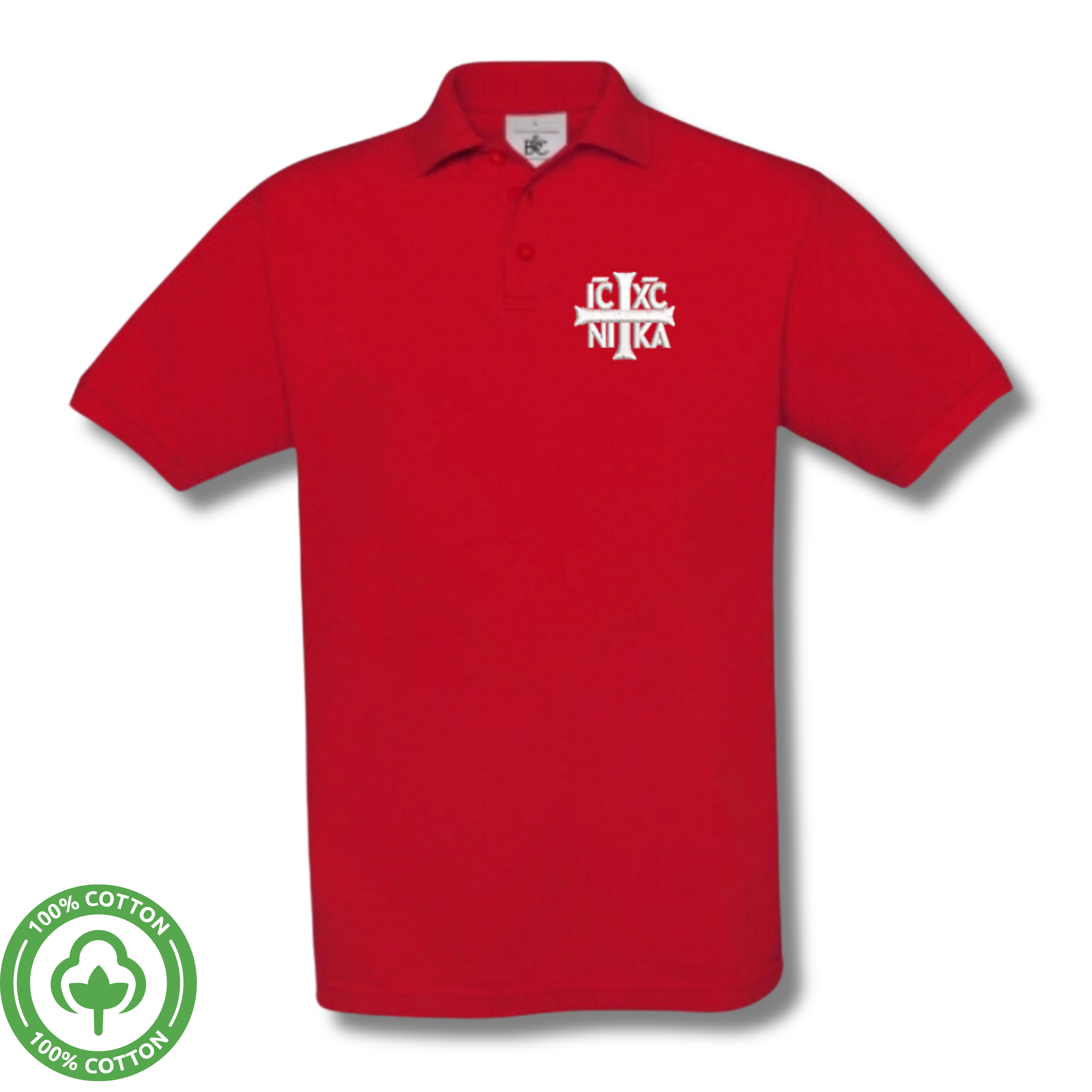 Tricou Polo SACRAL Rosu Brodat Ortodox Religios cu Semnul Sfintei Cruci IC XC NI KA, din Bumbac Organic