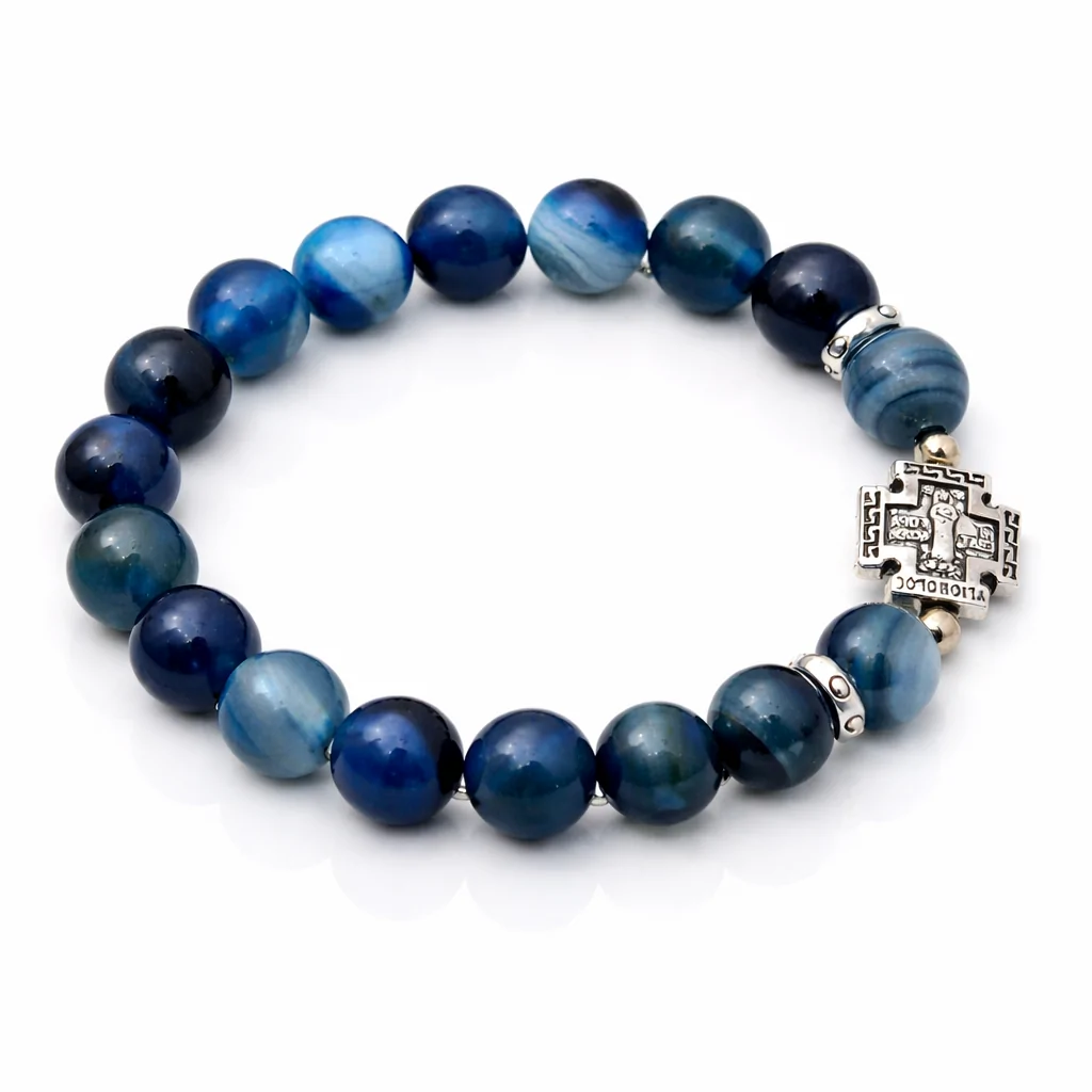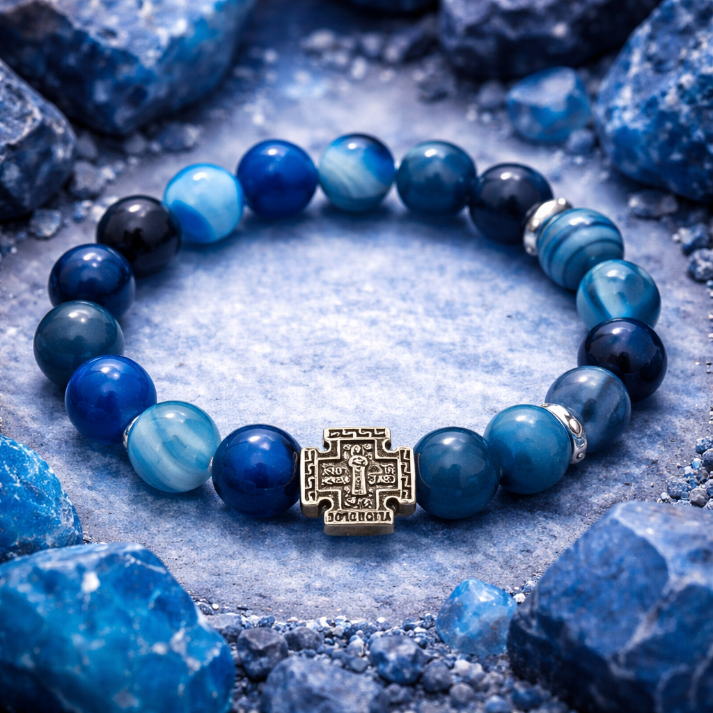 bratara agat bleu, bratara agat albastru, bratara piatra semipretioasa agat, bratara crestina cu cruce, metanier bratara, bratara ortodoxa, bratara pietre naturale
