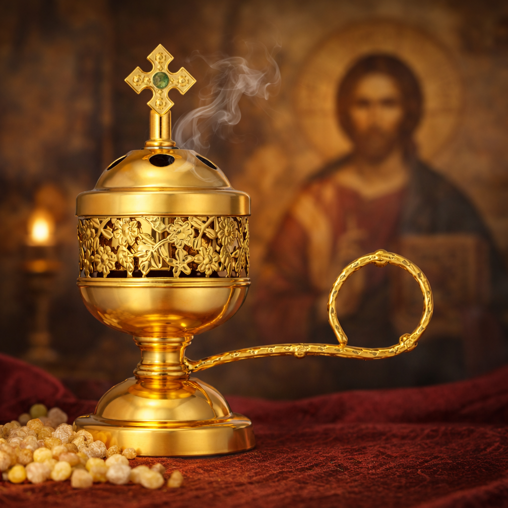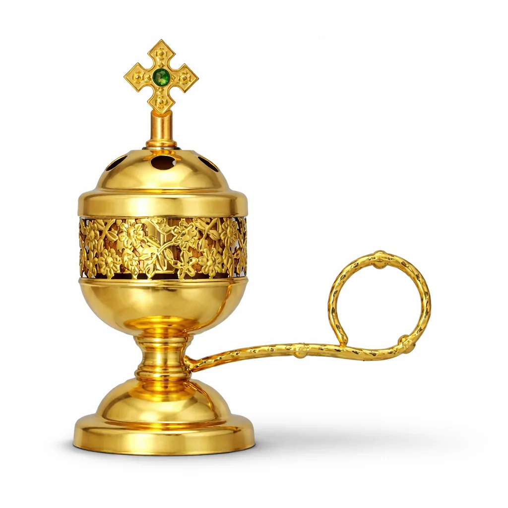 Această cătuie metalică elegantă este realizată cu grijă pentru a fi folosită în tămâierea casei sau în rugăciunea personală. Designul său este inspirat din obiectele liturgice tradiționale, oferind atât frumusețe, cât și utilitate practică.