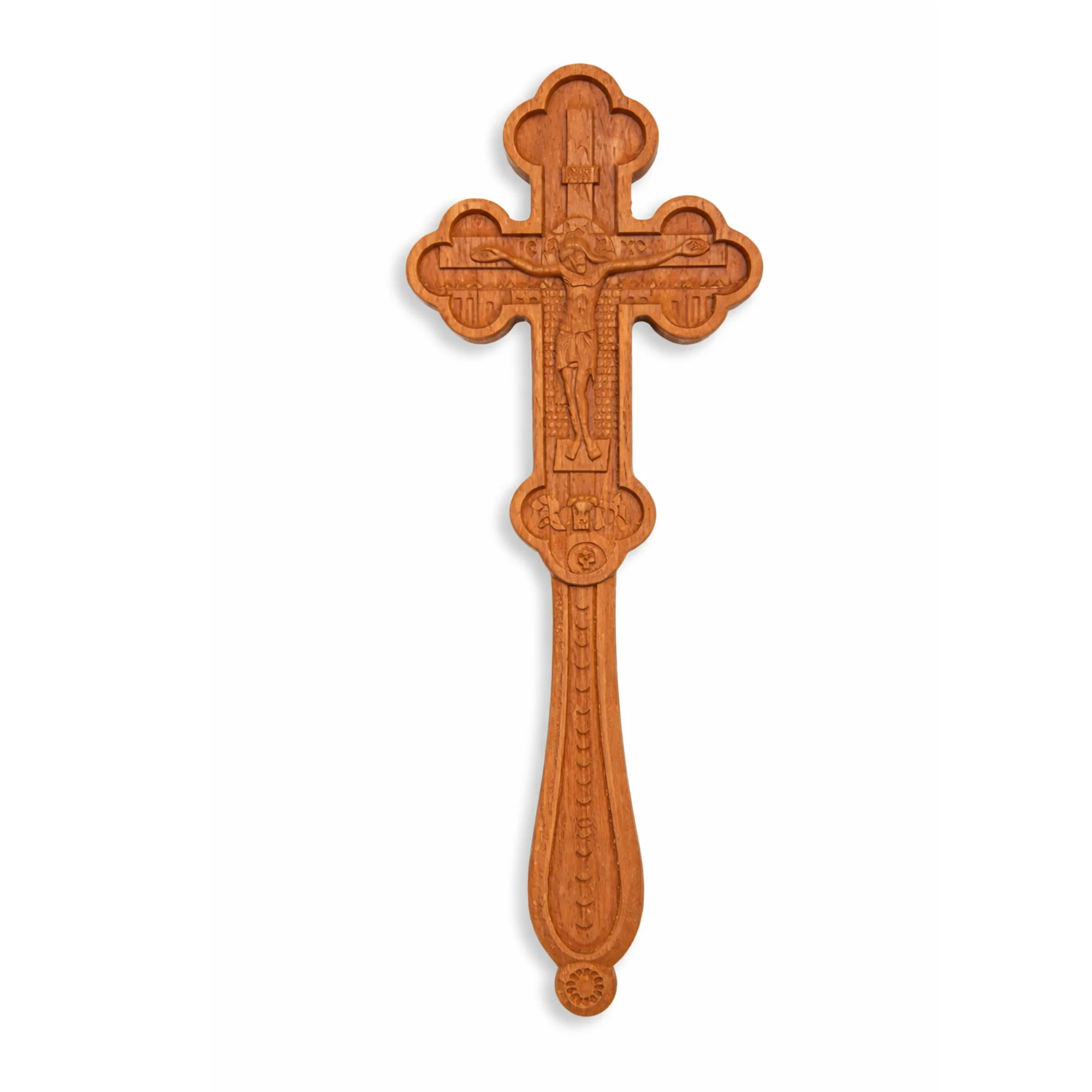 Această cruce de binecuvântare din lemn sculptat este realizată într-un stil tradițional ortodox, cu detalii fine lucrate cu grijă, care evidențiază două dintre cele mai importante momente din viața Mântuitorului.