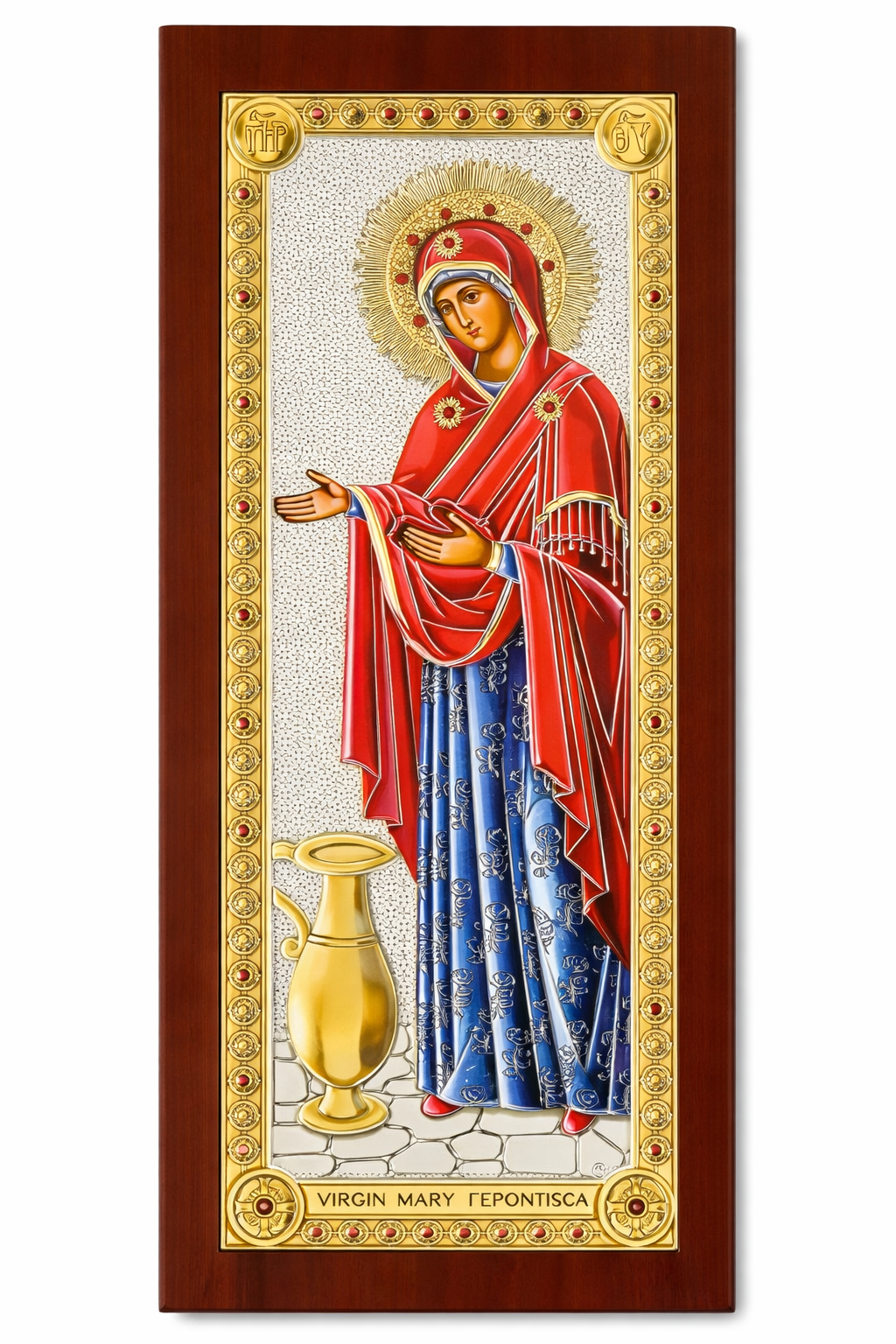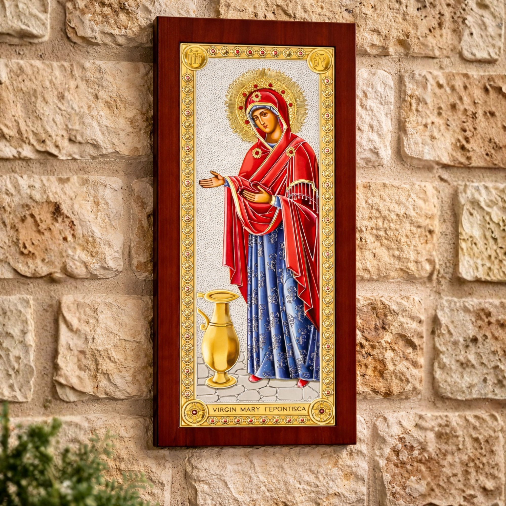 Icoana este realizată cu ramă elegantă și placaj argintat fin lucrat, având un aspect deosebit și potrivit atât pentru colțul de rugăciune al casei, cât și pentru a fi oferită cadou de binecuvântare.